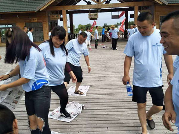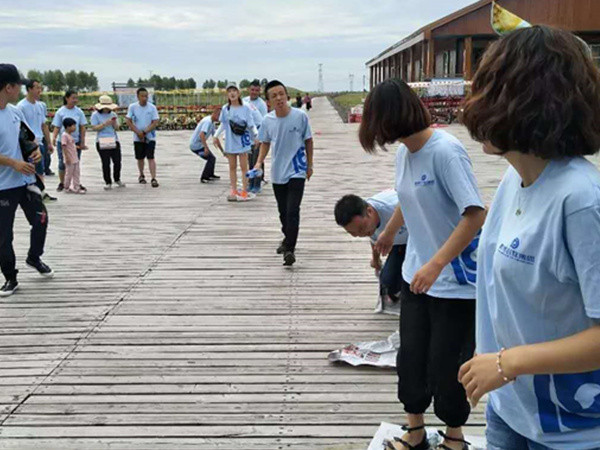 接下來(lái)這個(gè)游戲很有意義,全員參加,每個(gè)人用一根手指同時(shí)舉起自己團隊的紅旗桿,停留在一定位置,堅持10秒鐘,任何一個(gè)人手指離開(kāi)就算失敗,在金總的監督下,“不忘初心”隊又一次獲得了勝利。